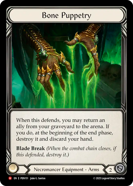 When this defends, you may return an ally from your graveyard to the arena. If you do, at the beginning of the end phase, destroy it and discard your hand.