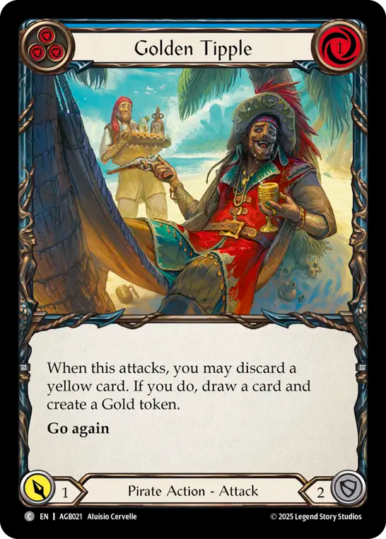 When this attacks, you may discard a yellow card. If you do, draw a card and create a Gold token.