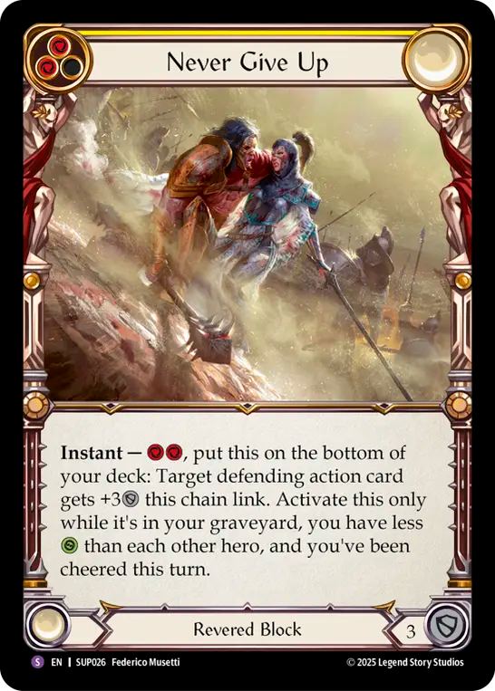 Instant — {r}{r}, put this on the bottom of your deck: Target defending action card gets +3{d} this chain link. Activate this only while it's in your graveyard, you have less {h} than each other hero, and you've been cheered this turn.