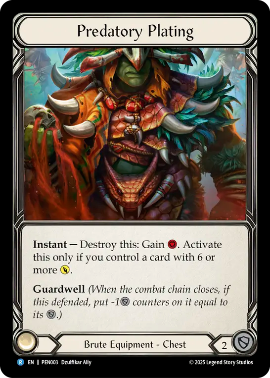 Instant — Destroy this: Gain {r}. Activate this only if you control a card with 6 or more {p}.