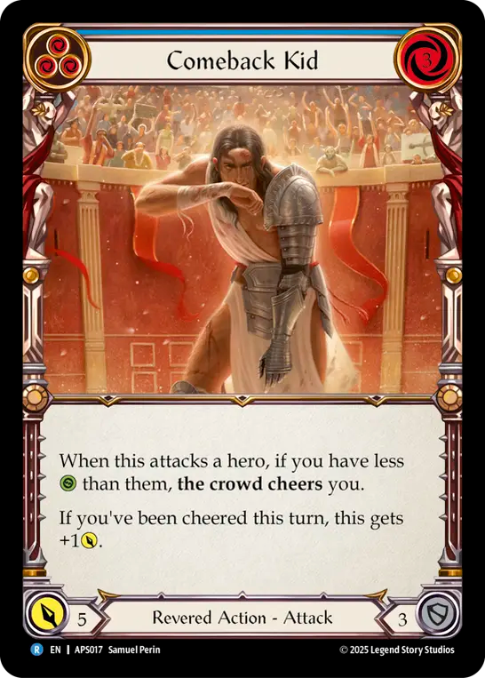 When this attacks a hero, if you have less {h} than them, the crowd cheers you.