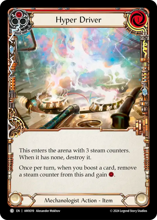 Once per turn, when you boost a card, remove a steam counter from this and gain {r}.