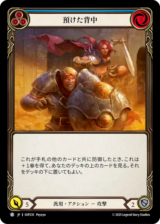 When this defends together with another card from hand, this gets +1{d} and look at the top card of your deck. You may put it on the bottom.