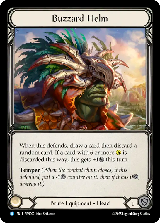 When this defends, draw a card then discard a random card. If a card with 6 or more {p} is discarded this way, this gets +1{d} this turn.