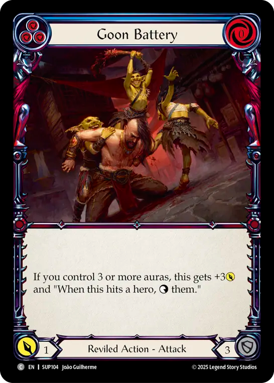 If you control 3 or more auras, this gets +3{p} and "When this hits a hero, {t} them."