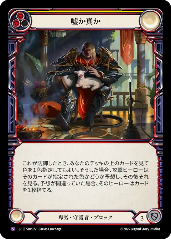 When this defends, you may look at the top card of your deck and choose a color. If you do, the attacking hero guesses if that card is the chosen color, then they look at it. If they guessed wrong, they discard a card.