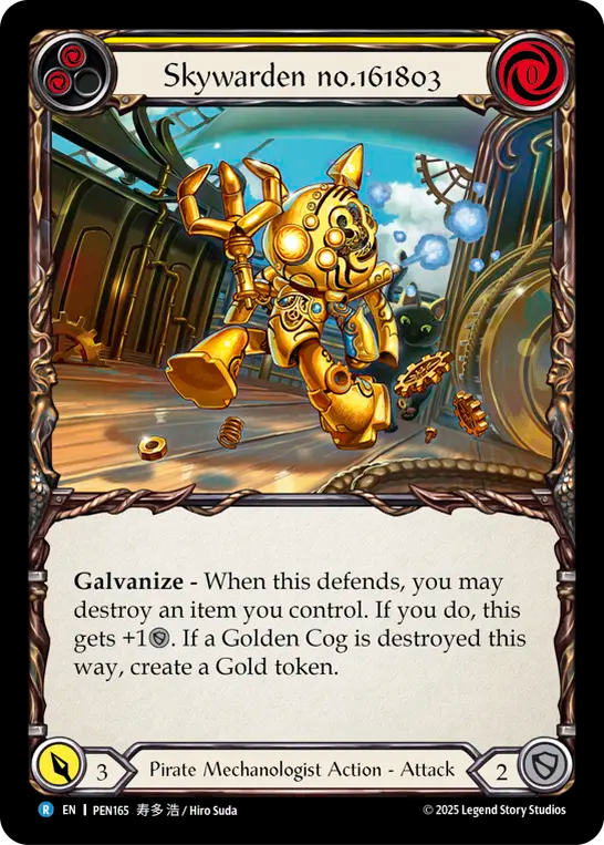 Galvanize - When this defends, you may destroy an item you control. If you do, this gets +1{d}. If a Golden Cog is destroyed this way, create a Gold token.