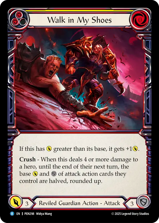 Crush - When this deals 4 or more damage to a hero, until the end of their next turn, the base {p} and {d} of attack action cards they control are halved, rounded up.